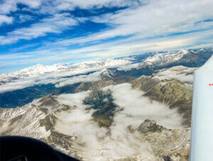 Après un vol d’essai concluant avec Eric Fumey et une météo favorable, je décolle de Pontarlier en direction de la Suisse, puis du col du Grand-Saint-Bernard, avec un passage au niveau 115 grâce à l’oxygène embarqué. Cela permet d’éviter une grande partie des nuages épars. Le panorama est exceptionnel !